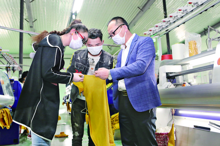4月13日,在阿克蘇阿樂興業(yè)針織有限公司針織車間內(nèi),來自浙江的技術(shù)員在指導學徒學習針織技術(shù)。近期以來,阿克蘇紡織工業(yè)城(開發(fā)區(qū))各企業(yè)在復工復產(chǎn)同時,不斷加大對新員工培訓力度,全力抓好生產(chǎn)。