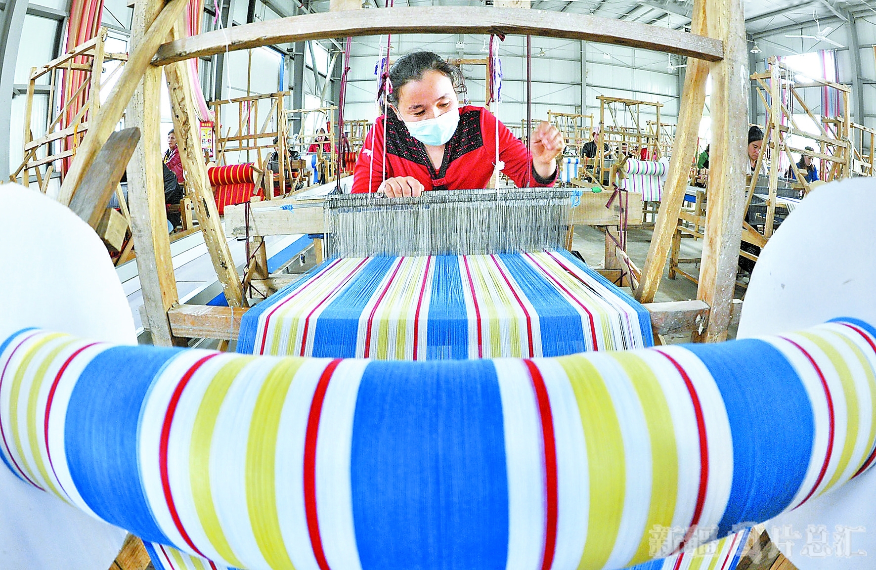 4月25日伽師縣江巴孜鄉(xiāng)依排克其村村民吐爾遜古麗·亞生在村辦企業(yè)車間織布。目前該村織布企業(yè)已吸納50多名村民就業(yè),其中貧困村民15人。