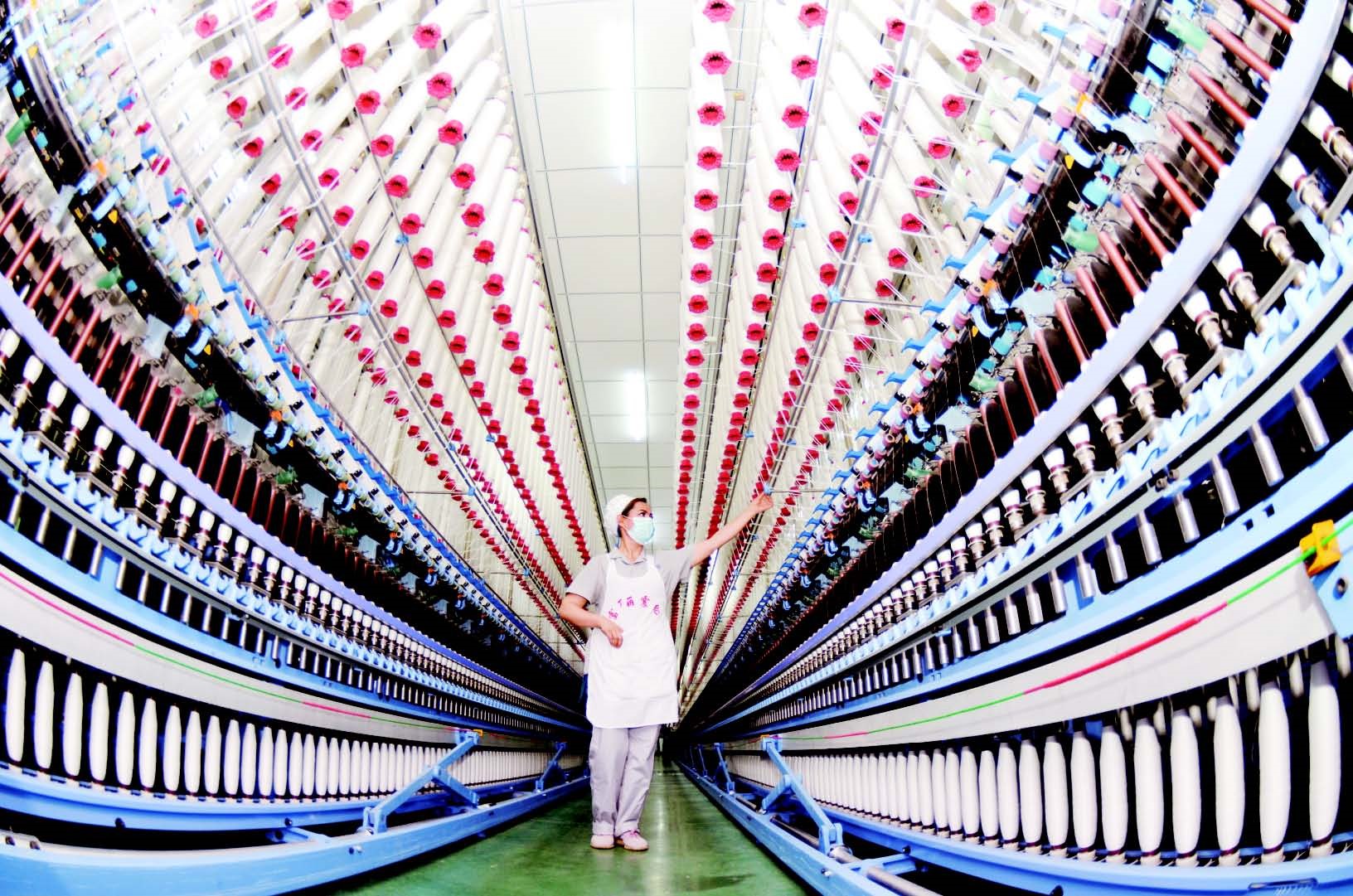 5月6日,在新疆富麗震綸棉紡有限公司環(huán)錠紡車間,工人在細(xì)紗機(jī)前作業(yè)。