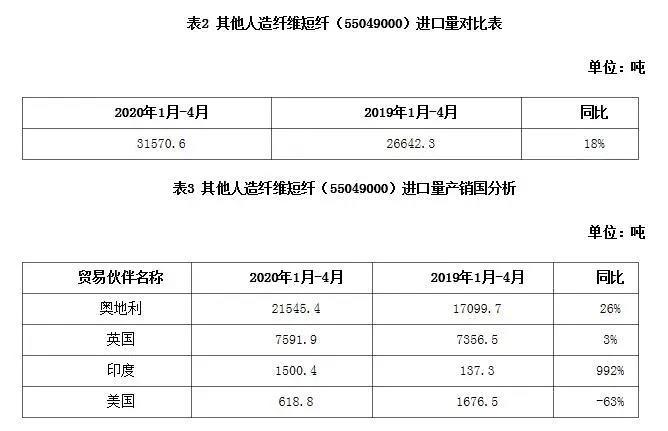 2020年1-4月,其他人造纖維短纖(55049000)累計(jì)進(jìn)口量約31570噸,同比增長(zhǎng)約18%,其主要產(chǎn)銷國中,奧地利進(jìn)口量同比增長(zhǎng)約26%,印度地區(qū)增量超預(yù)期,美國同比減量約63%。