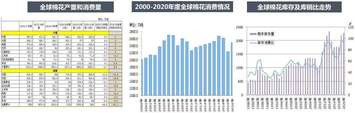 USDA6月最新全球棉花供需,本次報(bào)告產(chǎn)量較上月變化不大,全球消費(fèi)量繼續(xù)下調(diào),2019/20年度全球棉花消費(fèi)量下調(diào)51萬噸至2235萬噸,其中中國(guó)下調(diào)21.8萬噸、印度下調(diào)10.9萬噸。2020/21年度全球棉花消費(fèi)量下調(diào)45萬噸至2491萬噸,其中中國(guó)下調(diào)21.8萬噸、印度下調(diào)10.8萬噸。全球棉花期末庫(kù)存量繼續(xù)大幅上調(diào),2019/20年度全球棉花消費(fèi)量上調(diào)74萬噸至2189萬噸。2020/21年度全球棉花消費(fèi)量上調(diào)114萬噸至2278.9萬噸。2019年庫(kù)存消費(fèi)比98%的,達(dá)到了歷史最高峰。