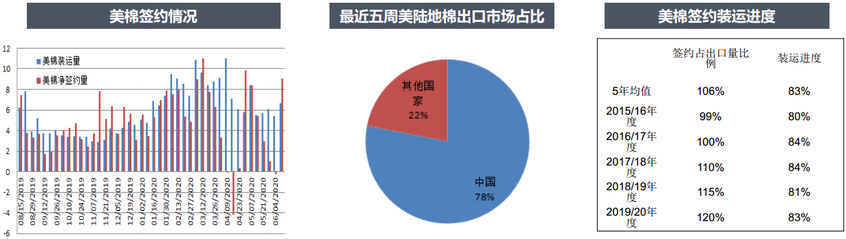 據(jù)USDA報(bào)告,美國(guó)農(nóng)業(yè)部報(bào)告顯示,2020年5月29日-6月4日,2019/20年度美國(guó)陸地棉凈簽約量9.06萬噸,較前周和前四周平均值大幅增長(zhǎng)。新增簽約主要來自中國(guó)(4.75萬噸)、越南(4萬噸)、巴基斯坦(2994噸)、土耳其(2517噸)。2019/20年度美國(guó)陸地棉裝運(yùn)量6.67萬噸,較前周增長(zhǎng)24%,較前四周平均值增長(zhǎng)184%,主要運(yùn)往中國(guó)(1.96萬噸)、越南(1.53萬噸)、土耳其(1.28萬噸)。截至當(dāng)周,美國(guó)陸地棉累計(jì)簽約量379.33萬噸,簽約進(jìn)度120%,5年均值106%;累計(jì)裝運(yùn)量263.31萬噸,裝運(yùn)進(jìn)度83%,5年均值83%。最近七周,中國(guó)突然大量簽約美國(guó)陸地棉,一共簽約28.47萬噸,上周簽約量為負(fù),本周數(shù)據(jù)4.75萬噸。