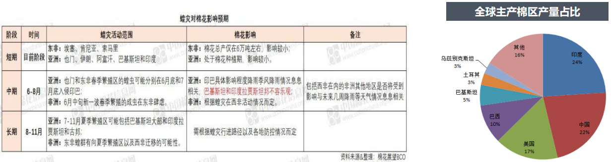 蝗災(zāi)將對(duì)印巴及非洲棉花造成何種程度的影響,還需要分階段來看。但根據(jù)當(dāng)前蝗蟲分布區(qū)域和活動(dòng)路徑來看,預(yù)計(jì)巴基斯坦大部分棉