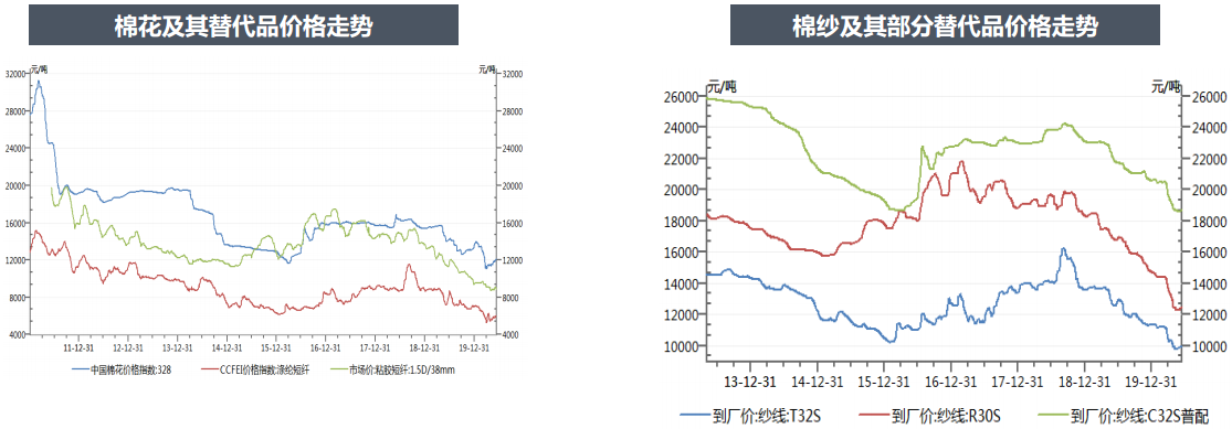 目前棉花、滌綸短纖、粘膠短纖價(jià)格都位于歷史相對(duì)低位,棉紗替代品價(jià)格也基本上是位于歷史價(jià)格低位。最近一周滌綸短纖、粘膠短纖價(jià)格相對(duì)穩(wěn)定。