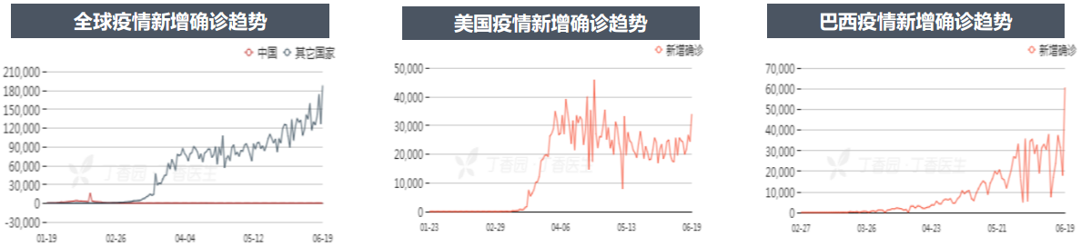 巴西日增超5萬,美國新增超3萬,智力也大增,美洲成為重災(zāi)區(qū),俄羅斯8千多,印度日新增超一萬(為單日最大增幅),全球新增難以控制。部分之前表現(xiàn)較好的國家,如國內(nèi)暴發(fā)北京疫情,德國出現(xiàn)肉聯(lián)廠大規(guī)模感染等,許多專家警告第二波疫情來臨的可能性。