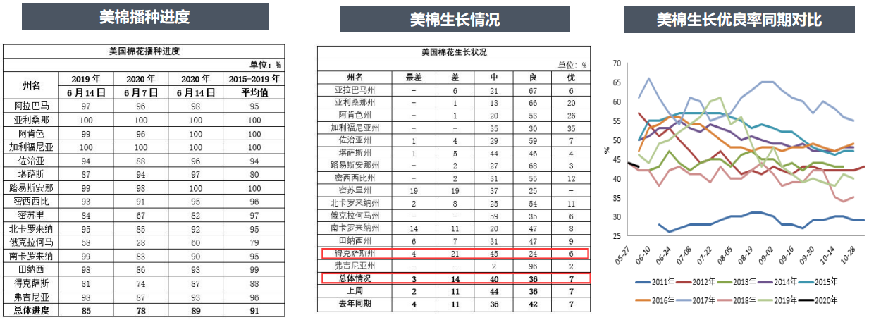 美國農(nóng)業(yè)部6月15日發(fā)布的美國棉花生產(chǎn)報告顯示,截至6月14日,美棉播種進度89%,比去年同期增加4個百分點,比過去5年平均值減少2個百分點。美棉現(xiàn)蕾率16%,比去年同期減少1個百分點,比過去5年平均值持平。美棉生長狀況達到良好以上的占43%,較前周持平,較去年同期減少6個百分點。主產(chǎn)棉區(qū)得州優(yōu)良率僅30%。