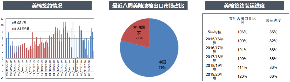 據(jù)USDA最新報告,6月11日一周,2019/20年度美國陸地棉凈簽約量2.21萬噸,環(huán)比減少75.5%,其中中國簽約2.06萬噸,裝運量7.9萬噸。截至當(dāng)周2019/20年度美國陸地棉累計簽約381.54萬噸,簽約進度120%(5年均值106%),累計裝運271.21萬噸,裝運進度86%(5年均值85%)。當(dāng)周2020/21年度美國陸地棉凈簽約3.36萬噸,截至當(dāng)周累計簽約72.03萬噸。最近八周中國累計簽約美國陸地棉30.53萬噸。
