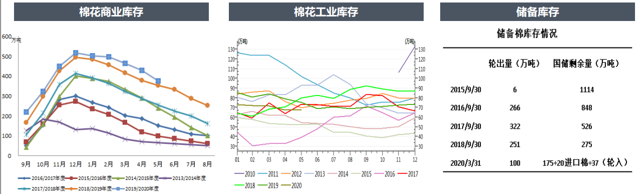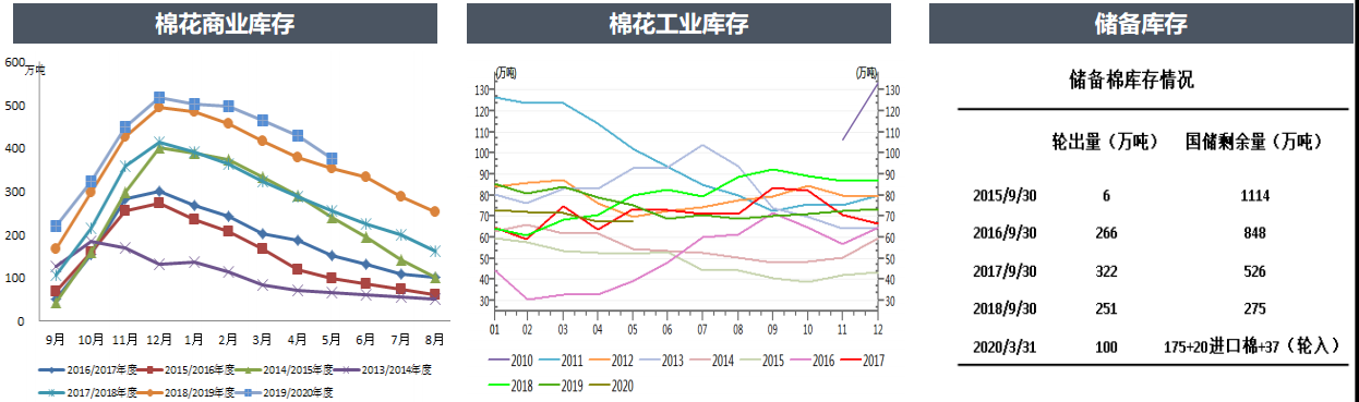 國儲庫存截止3月31日,儲備棉庫存有232萬噸。往年5月已開始輪出儲備棉,今年到現(xiàn)在仍沒有任何輪出消息,考慮今年棉價太低,國家不會再輪出增加市場負擔(dān),預(yù)計今年輪出可能性較低。