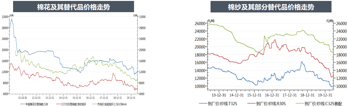 目前棉花、滌綸短纖、粘膠短纖價格都位于歷史相對低位,棉紗替代品價格也基本上是位于歷史價格低位。最近一周滌綸短纖和粘膠短纖價格相對穩(wěn)定。