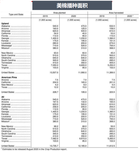 據(jù)美國農(nóng)業(yè)部(USDA)6月30日發(fā)布種植面積報告,2020年度美棉種植面積1218.5萬英畝,同比減少11.3%,其中陸地棉面積1199萬英畝,同比減少11.2%,皮馬棉面積19.5萬英畝,同比減少14.7%。