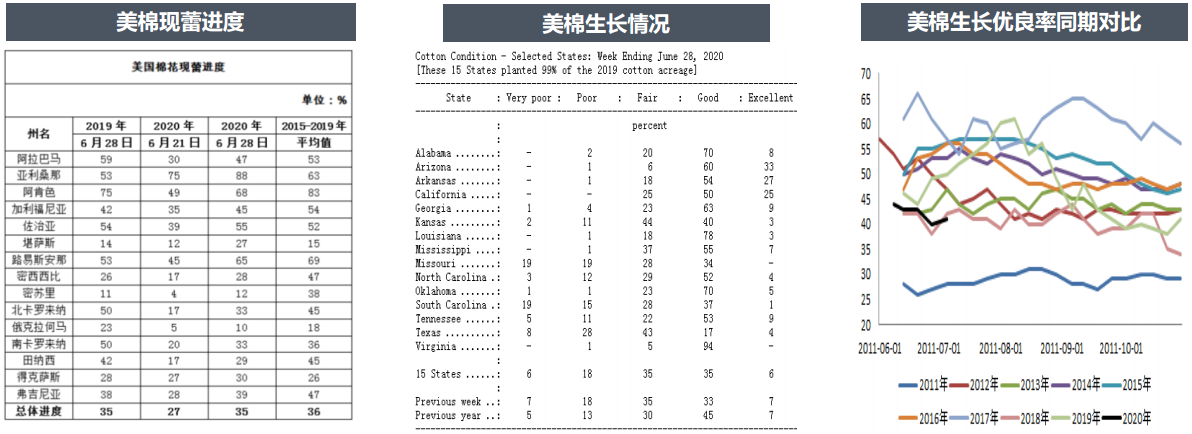 據(jù)美國農(nóng)業(yè)部(USDA)6月29日發(fā)布生產(chǎn)報告,截至6月28日,美棉現(xiàn)蕾率35%,前周27%,去年同期35%,5年均值36%。美棉結(jié)鈴進(jìn)度9%,前周6%,去年同期6%,5年均值7%。美棉優(yōu)良率41%,前周40%,去年同期52%;其中得州優(yōu)良率21%,較前周繼續(xù)下降2個百分點,去年同期優(yōu)良率44%。