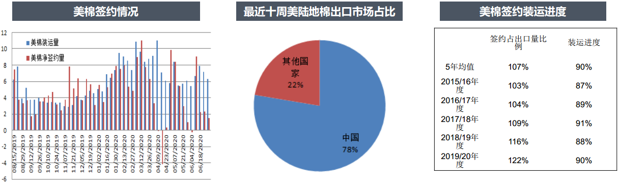 據(jù)美國農(nóng)業(yè)部(USDA)最新報告,6月25日一周,2019/20年度美國陸地棉凈簽約量1.53萬噸,同比減少34.5%,裝運量6.28萬噸,同比減少12.4%。截至當(dāng)周,2019/20年度美國陸地棉累計簽約量385.4萬噸,簽約進(jìn)度122%(5年均值107%),累計裝運量284.66萬噸,裝運進(jìn)度90%(5年均值90%)。