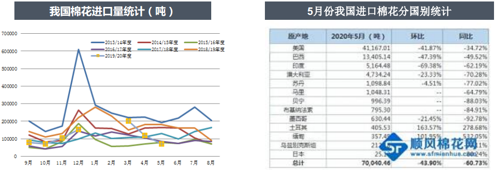 據(jù)海關(guān)總署,5月我國進(jìn)口棉花70040.46噸,環(huán)比減少44%,同比減少60.7%。截止5月2020年我國累計進(jìn)口棉花92萬噸,同比減少9.8%,2019/20年度我國累計進(jìn)口棉花133萬噸,同比減少17.9%。如果仍不發(fā)放進(jìn)口配額,則今年后期棉花進(jìn)口量更加有限。