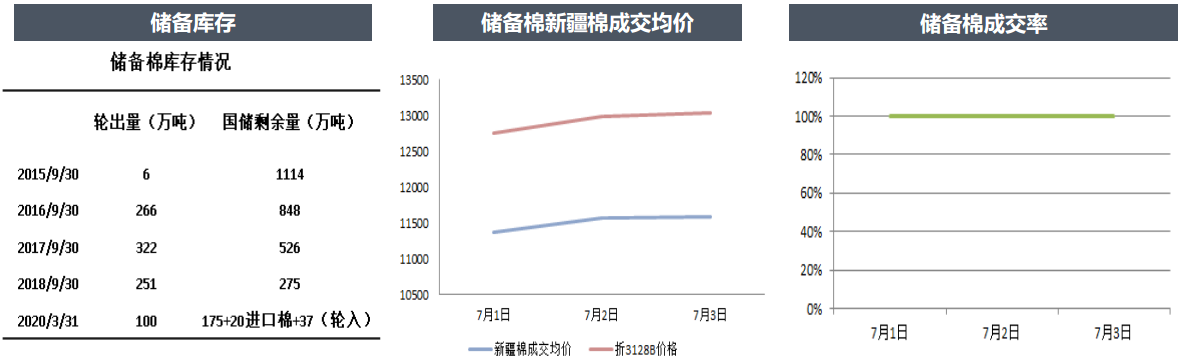 從7月1日到7月3日,儲備棉上市三天,累計上市2.41萬噸,成交率100%,成交均價11300元/噸上下波動,折3128B價格12700元/噸上下。其中新疆棉成交均價11500元/噸上下波動,折3128B價格13000元/噸附近。