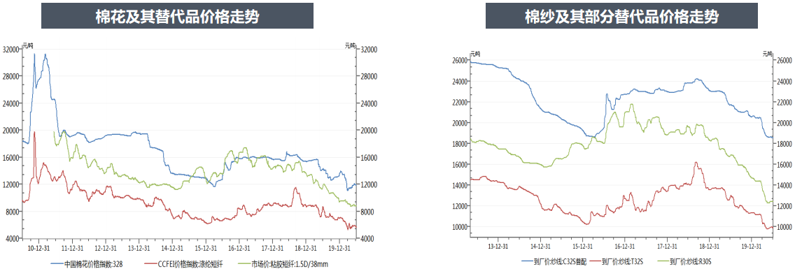 目前棉花、滌綸短纖、粘膠短纖價格都位于歷史相對低位,棉紗替代品價格也基本位于歷史價格低位。最近一周滌綸短纖和粘膠短纖價格相對穩(wěn)定。