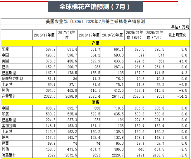 USDA發(fā)布7月棉花產(chǎn)需報(bào)告,大幅調(diào)減棉花產(chǎn)量,調(diào)減54.2萬(wàn)噸至2531萬(wàn)噸。其中主要調(diào)減美棉產(chǎn)量。全球棉花期末庫(kù)存也大幅下調(diào)41.3萬(wàn)噸至2237.6萬(wàn)噸,其中美棉期末庫(kù)存調(diào)減幅度最大。