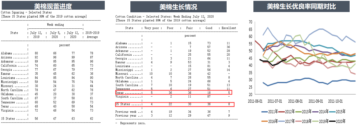 USDA7月13日發(fā)布美棉生產(chǎn)報(bào)告,截至7月12日,美棉現(xiàn)蕾率63%,較去年同期增加7個(gè)百分點(diǎn),較過(guò)去5年平均值增加1個(gè)百分點(diǎn)。美棉結(jié)鈴進(jìn)度18%,較去年同期持平,較過(guò)去5年平均值減少3個(gè)百分點(diǎn)。美棉生長(zhǎng)狀況達(dá)到良好以上的占44%,較前周增加1個(gè)百分點(diǎn),較去年同期減少12個(gè)百分點(diǎn)。其中得州優(yōu)良率23%,較前周增加1個(gè)百分點(diǎn),差苗率41%,較前周增加5個(gè)百分點(diǎn)。