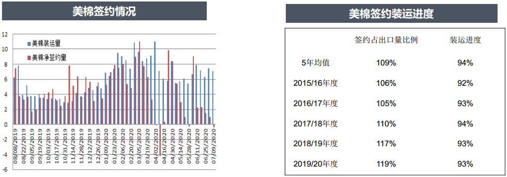 USDA發(fā)布美棉出口周報(bào),7月9日一周,2019/20年度美國(guó)陸地棉簽約量-0.4萬(wàn)噸,裝運(yùn)量7.07萬(wàn)噸,截至當(dāng)周,2019/20年度美國(guó)陸地棉累計(jì)完成簽約量386萬(wàn)噸,簽約進(jìn)度119%(5年均值109%),累計(jì)完成裝運(yùn)量299.2萬(wàn)噸,裝運(yùn)進(jìn)度93%(5年均值94%)。當(dāng)周20/21年度美國(guó)陸地棉簽約0.66萬(wàn)噸,20/21年度美國(guó)陸地棉累計(jì)簽約79.97萬(wàn)噸。