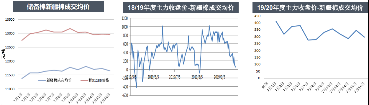 從7月1-16日,儲(chǔ)備棉上市9天,累計(jì)上市9.66萬(wàn)噸,成交率100%,成交均價(jià)先漲后跌。7月16日平均成交均價(jià)由11508元/噸折3128價(jià)格12776元/噸。其中新疆棉成交均價(jià)11654元/噸,折3128價(jià)格12960元/噸,地產(chǎn)棉成交均價(jià)11367元/噸,折3128價(jià)格12598元/噸。
