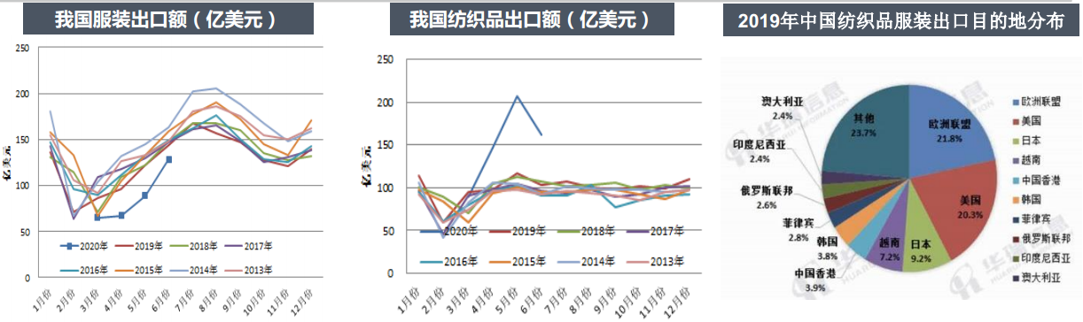 據(jù)海關(guān)統(tǒng)計(jì),2020年6月我國(guó)紡織品服裝出口額290.32億美元,環(huán)比減少2%,同比增長(zhǎng)18%。其中紡織品出口額161.57億美元,同比增長(zhǎng)57%;服裝出口額128.75億美元,同比下降10%(5月份同比下降27%)。