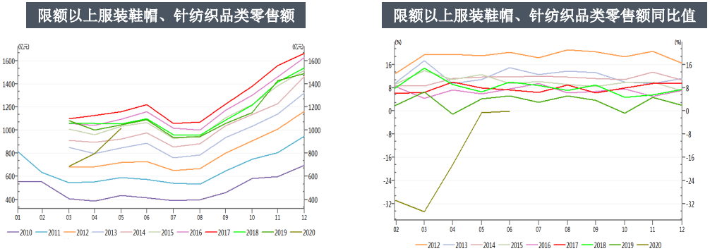 據(jù)國(guó)家統(tǒng)計(jì)局統(tǒng)計(jì):6月我國(guó)社會(huì)消費(fèi)品零售總額33526億元,同比下降1.8%。其中限額以上服裝鞋帽、針織品類零售額1059億元,同比下降0.1%。1-6月服裝鞋帽、針織品類累計(jì)零售額5120億元,同比減少19.6%。