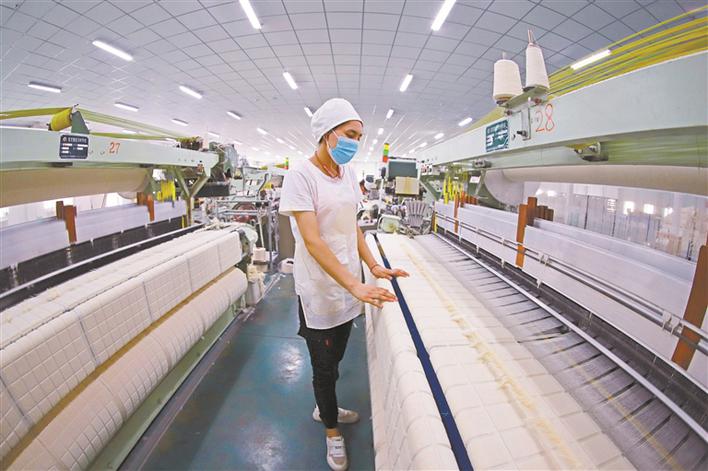7月26日,位于鐵門關(guān)經(jīng)濟技術(shù)開發(fā)區(qū)的新疆極限天霖紡織有限公司生產(chǎn)車間內(nèi),工人正在織布。上半年,鐵門關(guān)經(jīng)濟技術(shù)開發(fā)區(qū)多舉措力促企業(yè)達產(chǎn)達效,完成工業(yè)總產(chǎn)值26.5億元,完成工業(yè)增加值4.72億元。