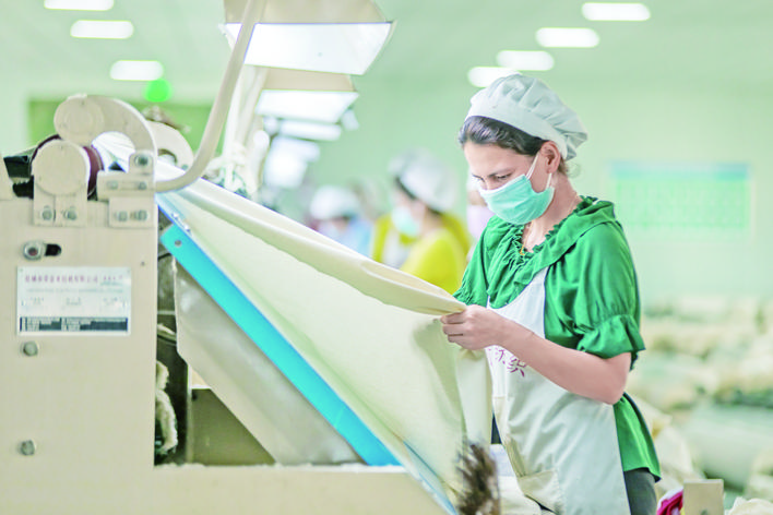 8月25日,阿克蘇疆渝紡織有限公司工人在生產(chǎn)線上忙碌。當(dāng)下正值紡織產(chǎn)品銷售旺季,阿克蘇紡織工業(yè)城(開發(fā)區(qū))各企業(yè)開足馬力忙生產(chǎn)。