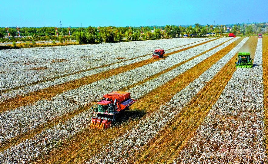 9月23日,大型采棉機(jī)在尉犁縣團(tuán)結(jié)鎮(zhèn)棉田里采收棉花。今年,尉犁縣種植棉花100余萬(wàn)畝。正值棉花采摘期,尉犁縣投入240余臺(tái)采棉機(jī),抓緊時(shí)間采收。