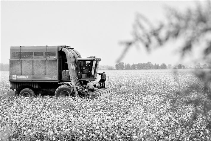 9月27日,二師三十三團五連棉田里一臺采棉機在采收棉花。作為國家重點產(chǎn)棉區(qū),目前,二師75萬畝棉花進入采收期,各墾區(qū)一眼望不到邊的銀色棉海,承載著職工一年的收獲和喜悅。