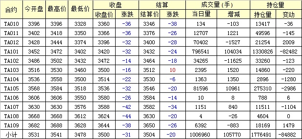 主力TA101合約當日交易走勢