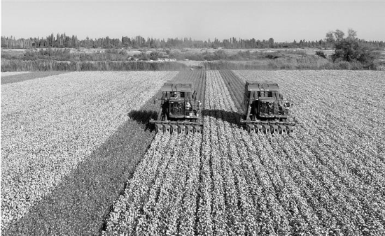 10月3日,在四師六十三團(tuán)四連一塊棉田里,兩臺采棉機(jī)來回穿梭采收棉花。據(jù)了解,今年四師種植棉花13萬畝,預(yù)計籽棉平均畝產(chǎn)350公斤以上。