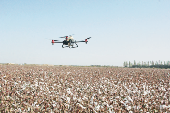 10月12日,阿瓦提縣塔木托格拉克鎮(zhèn)英買里村棉農(nóng)利用無人機為棉花噴灑脫葉劑。據(jù)了解,該鎮(zhèn)16.4萬畝棉花進入采摘期,對9.7萬畝機采棉進行噴灑脫葉劑,促進棉花快開、集中開,增強棉花脫葉效果,提高機械采凈率。