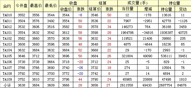 主力TA101合約當日交易走勢