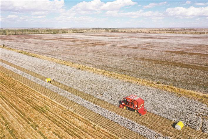 10月23日,采棉機在十師一八四團棉田里采收棉花。一八四團地處高緯度地區(qū),是次宜植棉區(qū)。該團通過推廣節(jié)水灌溉等技術(shù),發(fā)展棉花種植產(chǎn)業(yè),今年種植棉花7.3萬畝,籽棉單產(chǎn)超過400公斤。