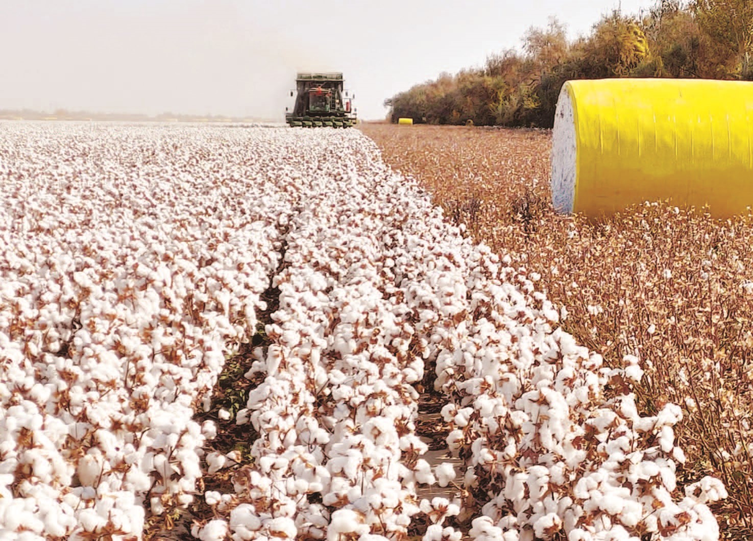 10月31日,在利華現(xiàn)代農(nóng)業(yè)有限公司連片種植的棉花地里,采棉機(jī)將采收的籽棉打包成巨型棉圈。