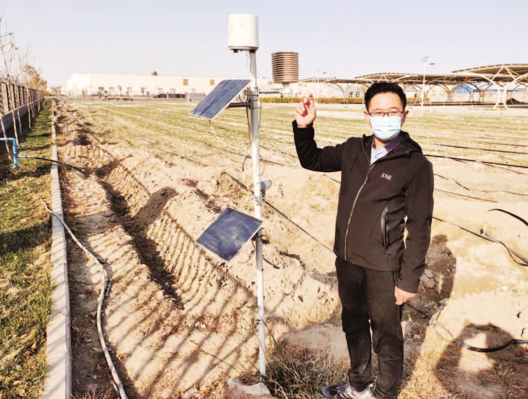 11月1日,巴州極飛農(nóng)業(yè)航空科技有限公司智慧農(nóng)業(yè)應(yīng)用部負責(zé)同志艾海鵬向參觀者介紹農(nóng)業(yè)物聯(lián)網(wǎng)“稻草人”的功能。