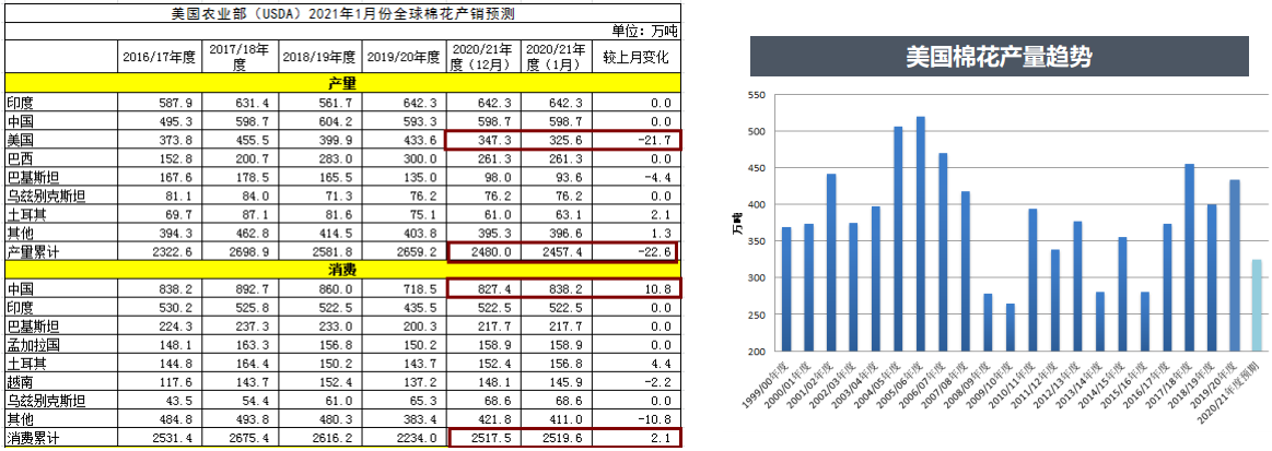 USDA全球棉花供需報告下調(diào)2020年度全球棉花產(chǎn)量和期末庫存,上調(diào)全球棉花消費。其中美棉產(chǎn)量下調(diào)21.7萬噸至325.6萬噸,中國棉花消費上調(diào)10.8萬噸至838.2萬噸。全球棉花庫存量下調(diào)26.2萬噸至2097萬噸。