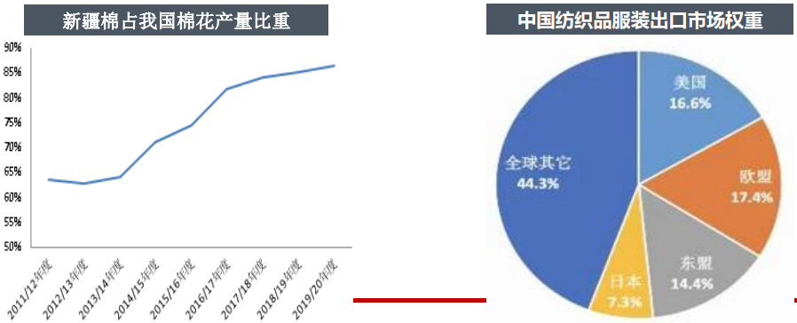 從終端消費結(jié)構(gòu)看,我國紡織品服裝內(nèi)銷外銷比例差不多一半一半,中國出口美國市場占中國紡織品服裝總的出口市場比例在17%左右。按照終端消費總量在1000萬噸計算(其中新疆棉占到50%左右,地產(chǎn)棉占到10%左右,進(jìn)口棉占比小于20%,進(jìn)口棉紗量占到20%左右),折算下來美國限制新疆棉將直接影響新疆棉量在50萬噸左右。