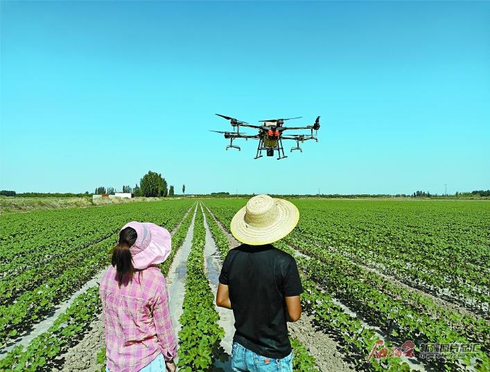 6月9日,溫宿縣克孜勒鎮(zhèn)博然其村,村民操作無(wú)人機(jī)為棉田打藥。近年來(lái),該縣鼓勵(lì)支持農(nóng)民成立農(nóng)業(yè)合作社,并引進(jìn)無(wú)人駕駛播種機(jī)、植保無(wú)人機(jī)、采棉機(jī)等,提高農(nóng)業(yè)生產(chǎn)機(jī)械化水平。