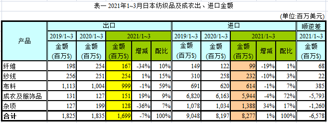 2021年1-3月進口總值82.8億美元,較前一年度同期成長1%,主要進口項目:成衣及服飾品進口值59.4億美元,占總進口值72%,其次為雜項產(chǎn)品,占總進口值17%。各項產(chǎn)品除雜項以外,進口值均較前一年度同期衰退,其中衰退最多者為纖維計衰退19%;雜項進口值較前一年度同期成長34%;進口大宗的成衣及服飾品則衰退4%(詳表一、圖二)。