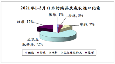 圖二 2021年1-3月日本紡織品及成衣進口比重