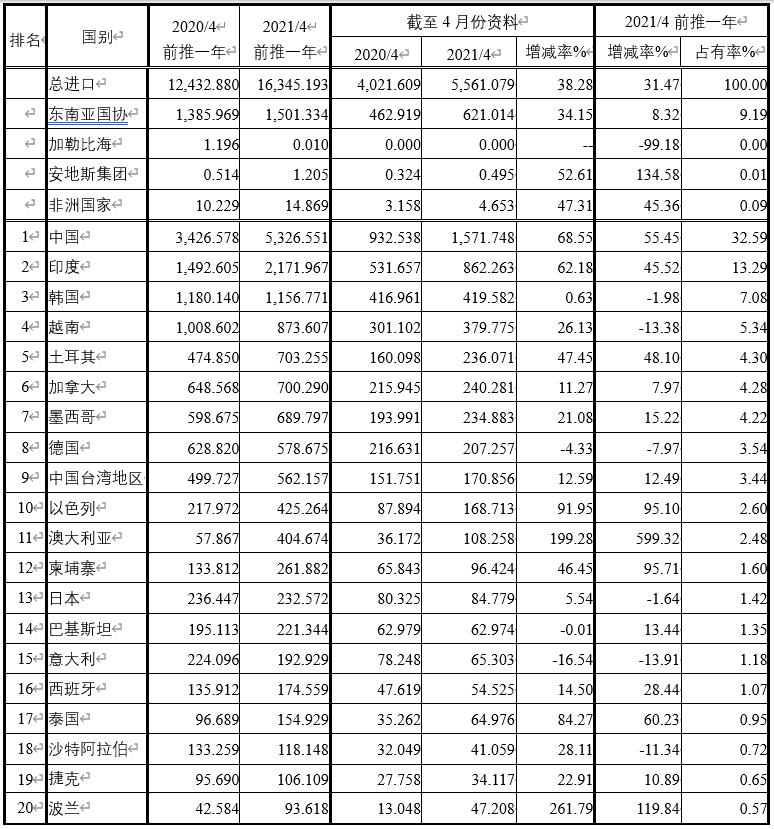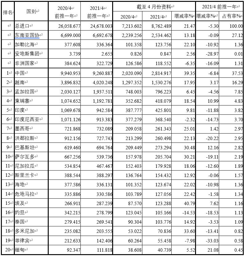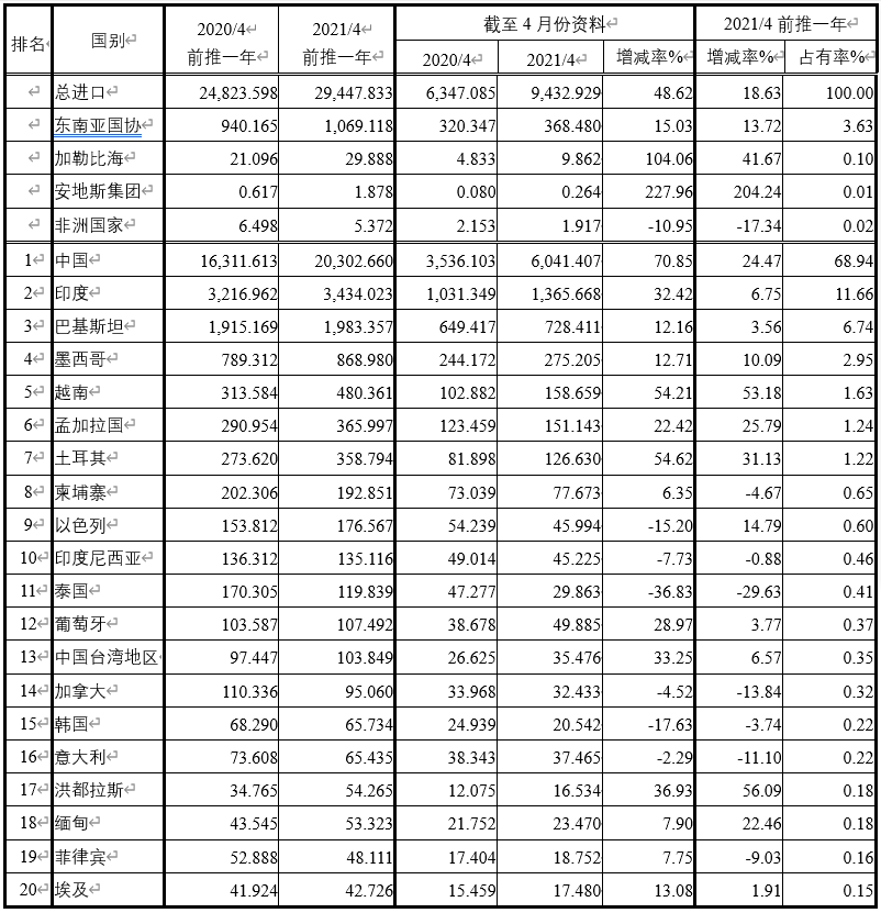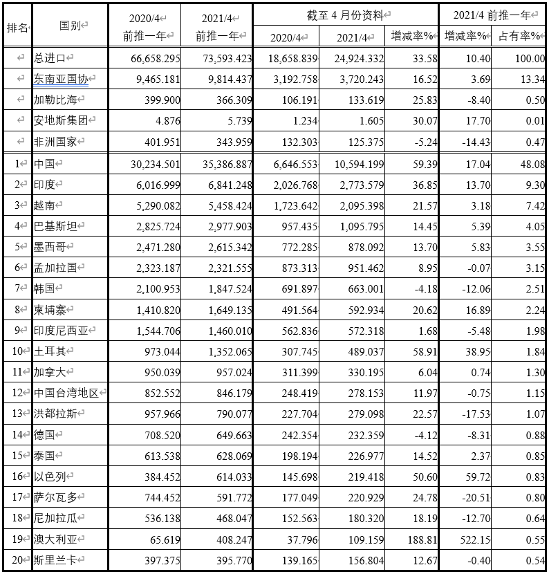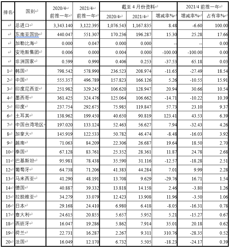 注:依2021年4月前推一年進(jìn)口占有率排序