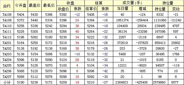 主力TA109合約當日交易走勢