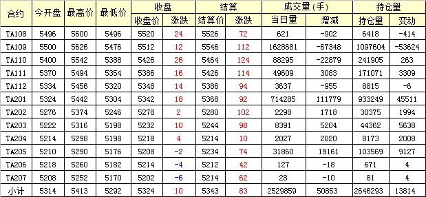 主力TA109合約當日交易走勢