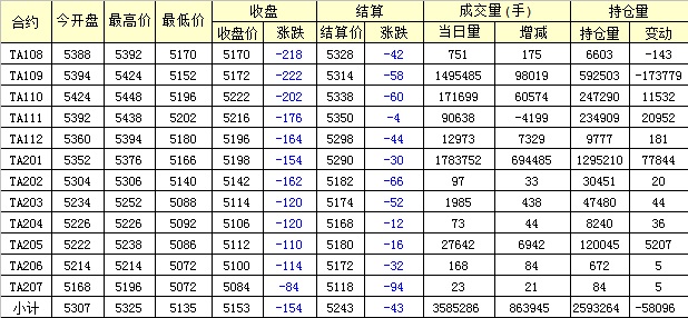 主力TA109合約當日交易走勢