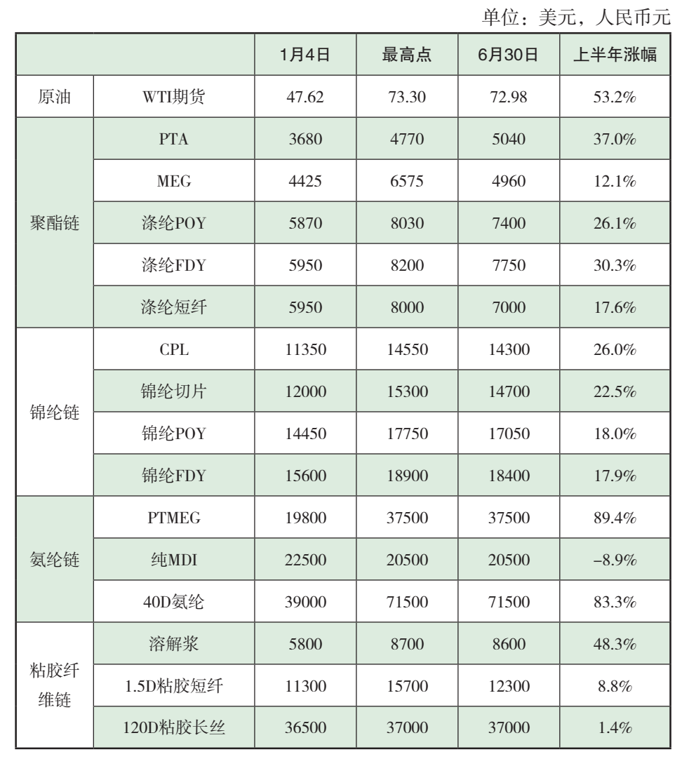 表1 上半年化纖主要產(chǎn)品及原料價格變化