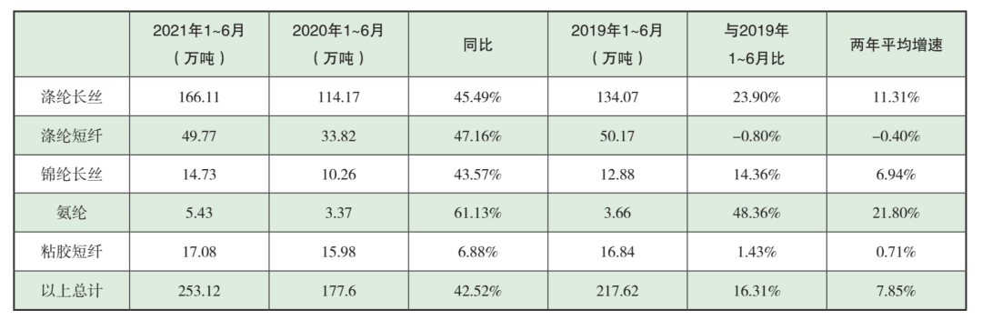 上半年,化纖行業(yè)總體開工負(fù)荷較2020年同期明顯提升,固然有2020年同期基數(shù)較低的因素,但和近幾年來同期水平相比也是處于高位。據(jù)國家統(tǒng)計局?jǐn)?shù)據(jù),1-6月化纖產(chǎn)量為3337萬噸,同比增加17.12%。為避免由于2020年低基數(shù)而造成的高增長對行業(yè)運行態(tài)勢的誤判,我們以2019年上半年為基期,采用幾何平均法計算(下同),化纖產(chǎn)量兩年平均增速為9.10%。