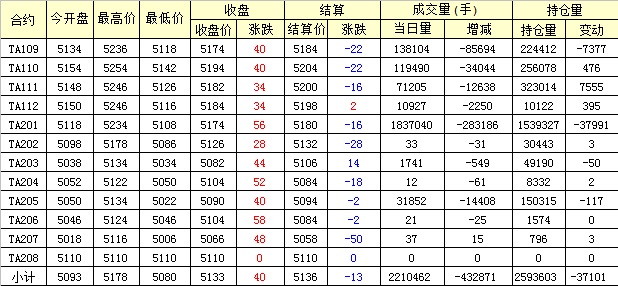 主力TA109合約當日交易走勢