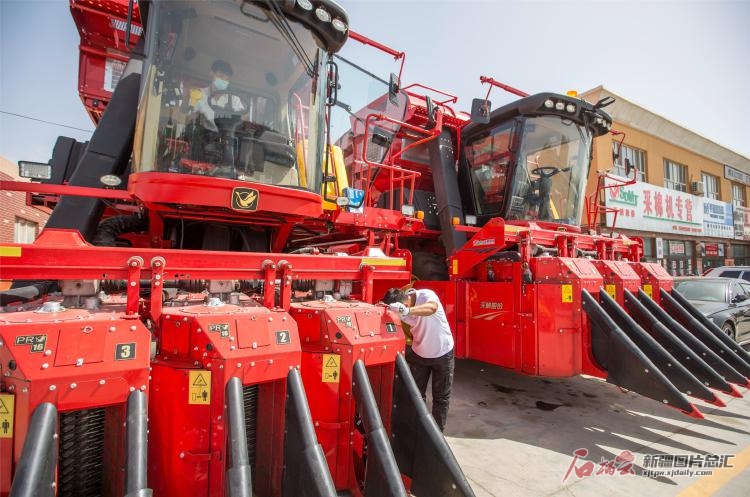 9月9日,農(nóng)技人員在庫車市惠民農(nóng)機綜合市場一家農(nóng)機銷售點對采棉機進行檢測。庫車市155萬畝棉花即將迎來采收季,各農(nóng)機銷售點、合作社加緊對采棉機械設備進行全面檢測和調(diào)試,為棉花采收打好基礎。