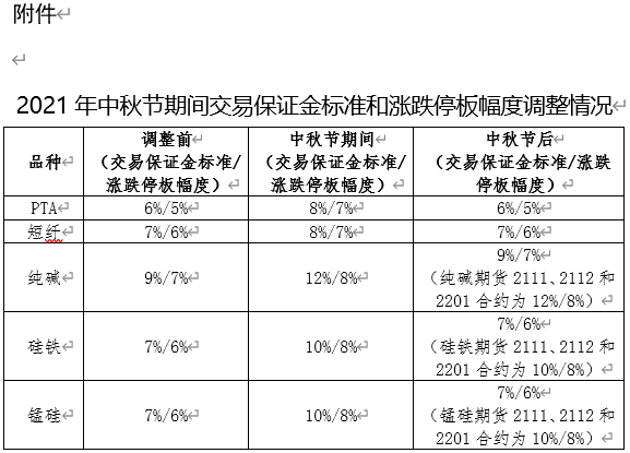 根據(jù)《鄭州商品交易所期貨交易風(fēng)險(xiǎn)控制管理辦法》第九條規(guī)定,經(jīng)研究決定,對(duì)2021年中秋節(jié)期間部分期貨合約交易保證金標(biāo)準(zhǔn)和漲跌停板幅度作如下調(diào)整: